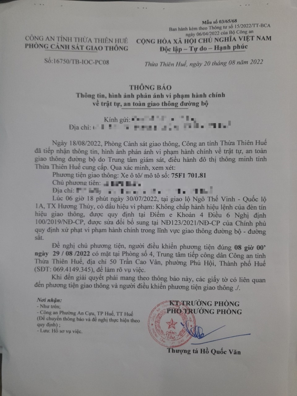 Vào lúc 06 giờ 18 phút ngày 30/07/2022, mô tô mang biển kiểm soát 75F170181 không chấp hành hiệu lệnh của đèn tín hiệu giao thông tại giao lộ Quốc Lộ 1A - Ngô Thế Vinh.