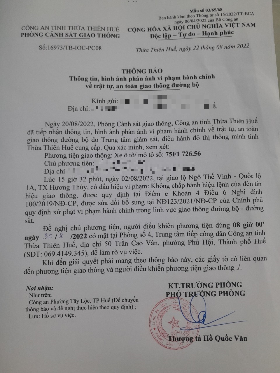 Vào lúc 15 giờ 32 phút, ngày 02/08/2022 Xe máy mang biển kiểm soát 75F172656 Không chấp hành hiệu lệnh của đèn tín hiệu giao thông tại địa điểm Ngô Thế Vinh - QL1A.