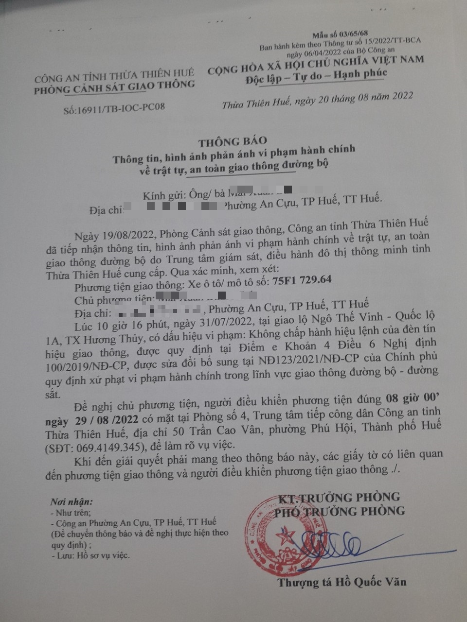 Vào lúc 10 giờ 16 phút, ngày 31/07/2022 Xe máy mang biển kiểm soát 75F172964 Không chấp hành hiệu lệnh của đèn tín hiệu giao thông tại địa điểm Ngô Thế Vinh - QL1A