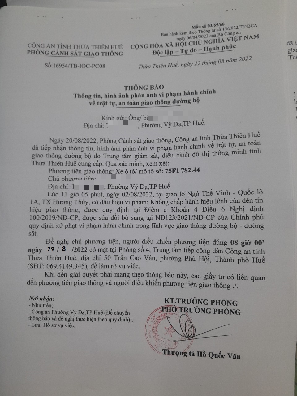 Vào lúc 11 giờ 05 phút, ngày 02/08/2022 Xe máy mang biển kiểm soát 75F178244 Không chấp hành hiệu lệnh của đèn tín hiệu giao thông tại địa điểm Ngô Thế Vinh - QL1A.