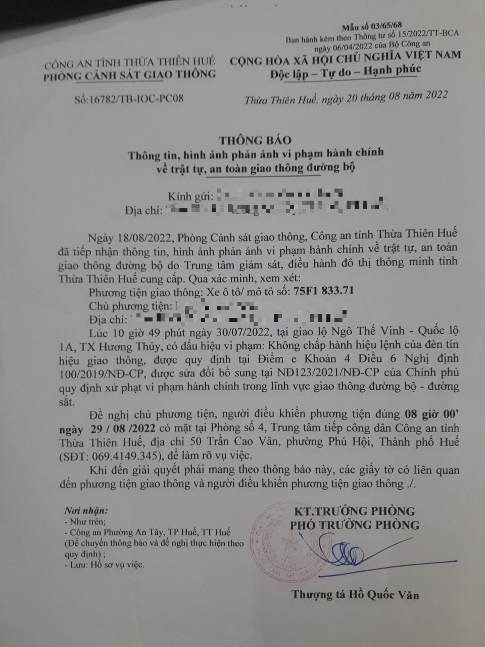 Vào lúc 10 giờ 49 phút ngày 30/07/2022, mô tô mang biển kiểm soát 75F183371 không chấp hành hiệu lệnh của đèn tín hiệu giao thông tại giao lộ Quốc Lộ 1A - Ngô Thế Vinh.
