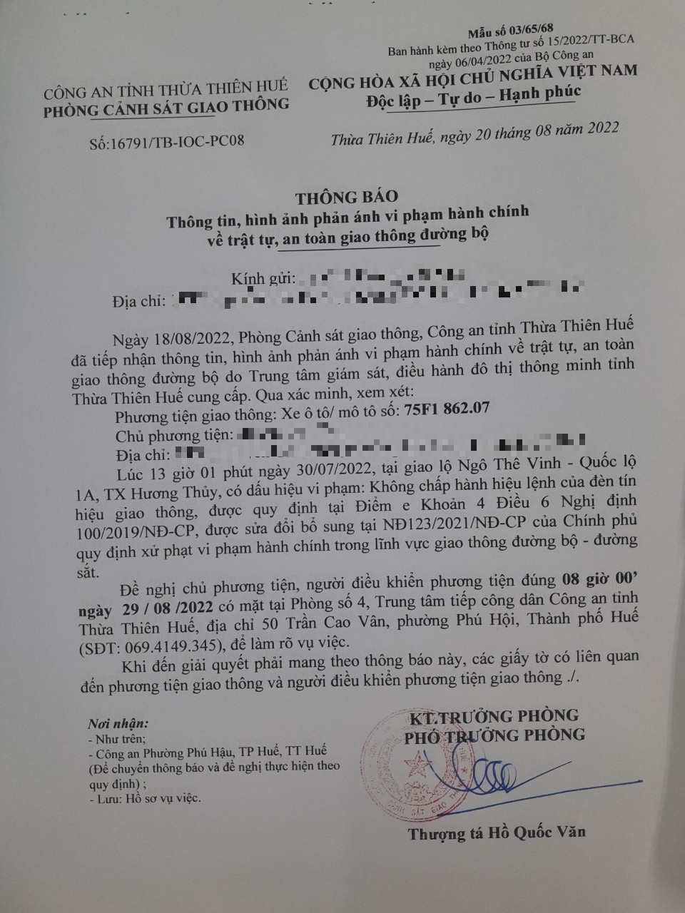 Vào lúc 13 giờ 01 phút ngày 30/07/2022, mô tô mang biển kiểm soát 75F186207 không chấp hành hiệu lệnh của đèn tín hiệu giao thông tại giao lộ Quốc Lộ 1A - Ngô Thế Vinh.