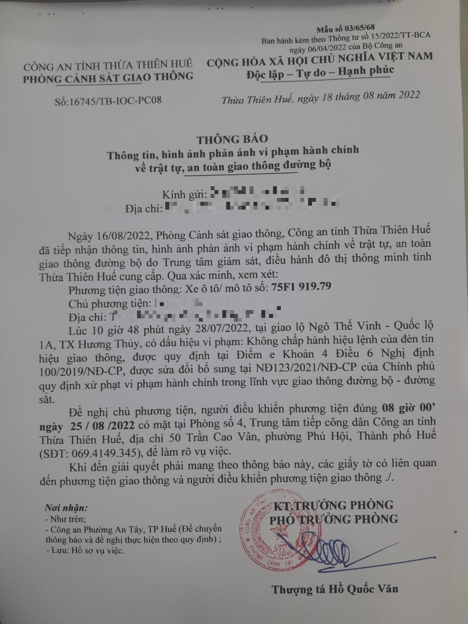 Vào lúc 10 giờ 48 phút ngày 28/07/2022, mô tô mang biển kiểm soát 75F191979 không chấp hành hiệu lệnh của đèn tín hiệu giao thông tại giao lộ Quốc Lộ 1A - Ngô Thế Vinh.