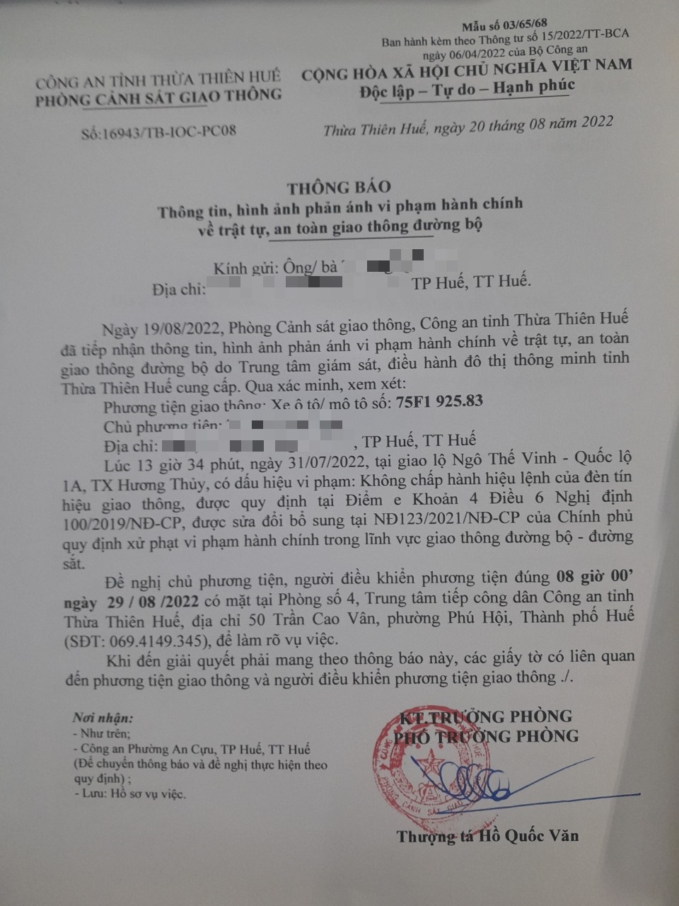 Vào lúc 13 giờ 34 phút, ngày 31/07/2022 Xe máy mang biển kiểm soát 75F192583 Không chấp hành hiệu lệnh của đèn tín hiệu giao thông tại địa điểm Ngô Thế Vinh - QL1A