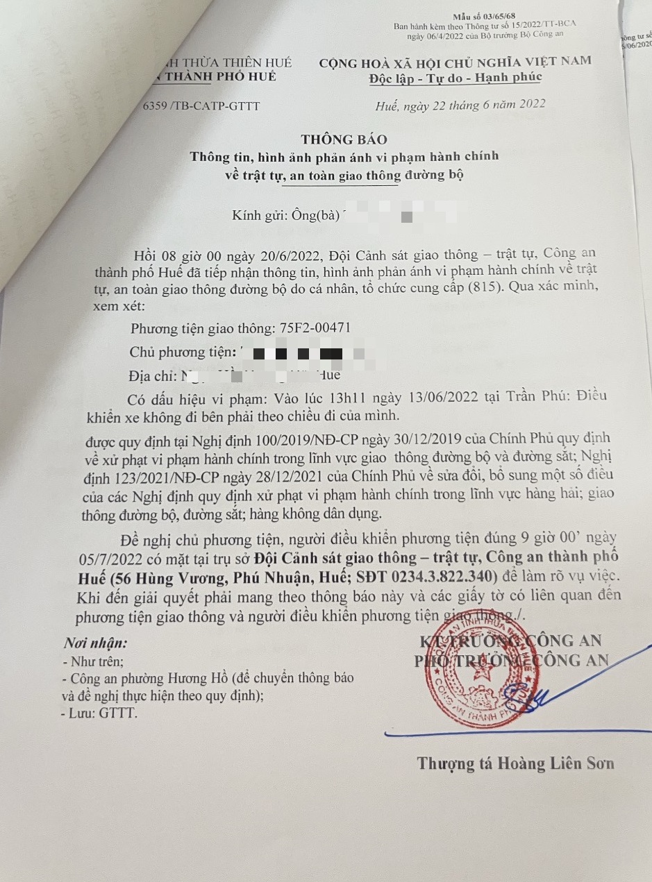 Công an thành phố đã lập hồ sơ, thông báo chủ phương tiện đến làm việc vào ngày 05/7/2022. Tuy nhiên, hiện chủ phương tiện vẫn chưa trình diện tại cơ quan. Công an thành phố Huế sẽ tiếp tục thông báo lực lượng tuần tra trên địa bàn, trong quá trình làm nhiệm vụ phát hiện, xử lý.