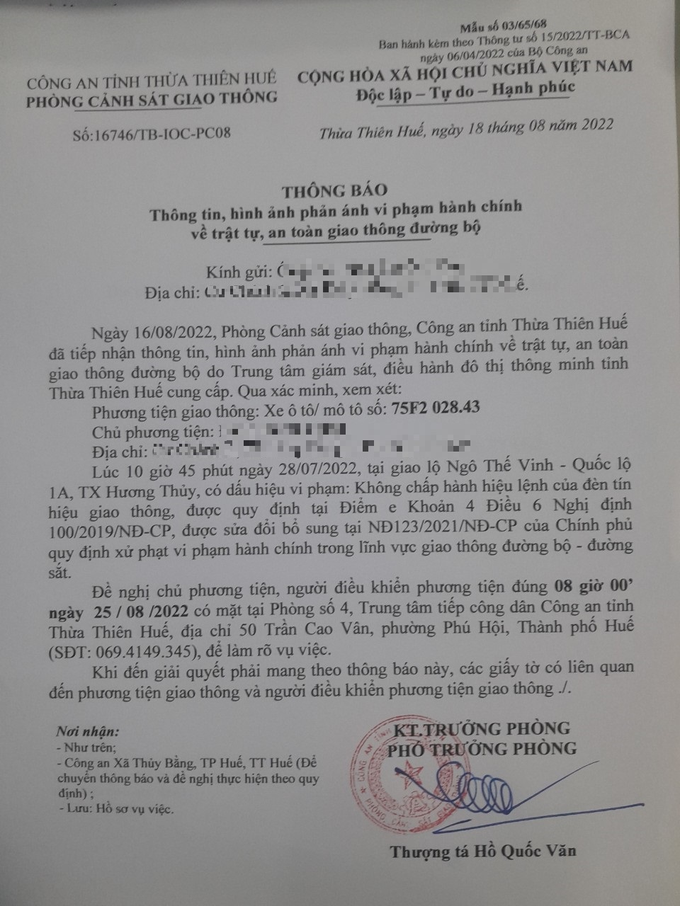 Vào lúc 10 giờ 45 phút ngày 28/07/2022, mô tô mang biển kiểm soát 75F202843 không chấp hành hiệu lệnh của đèn tín hiệu giao thông tại giao lộ Quốc Lộ 1A - Ngô Thế Vinh.