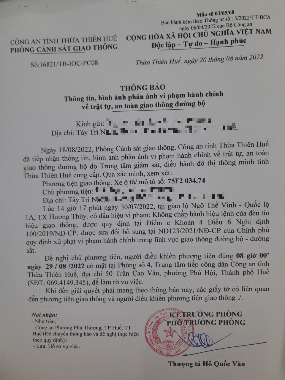 Vào lúc 14 giờ 17 phút ngày 30/07/2022, mô tô mang biển kiểm soát 75F203474 không chấp hành hiệu lệnh của đèn tín hiệu giao thông tại giao lộ Quốc Lộ 1A - Ngô Thế Vinh.