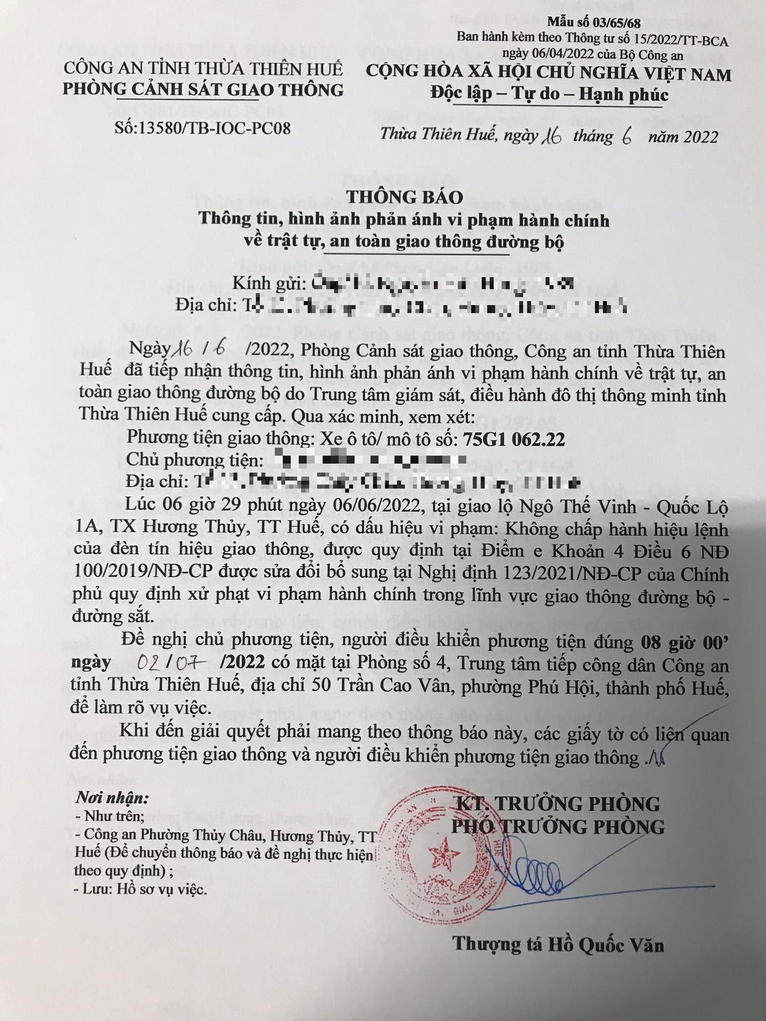 Vào lúc 06 giờ 29 phút ngày 06/06/2022, mô tô mang biển kiểm soát 75G106222 không chấp hành hiệu lệnh của đèn tín hiệu giao thông tại giao lộ Quốc Lộ 1A - Ngô Thế Vinh.