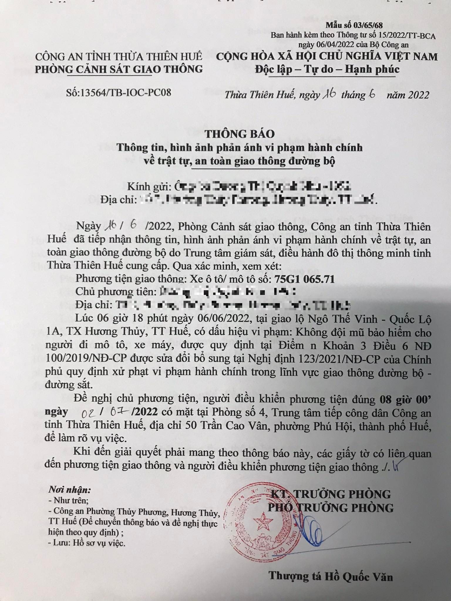 Phòng Cảnh sát giao thông xác định lỗi vi phạm của người điều khiển phương tiện 75G106571 sau: Không đội mũ bảo hiểm cho người đi mô tô, xe máy, quy định tại điểm n khoản 3 điều 6 Nghị định 100/2019/NĐ-CP được sửa đổi, bổ sung tại Nghị định 123/NĐ-CP ngày 28/12/2021.