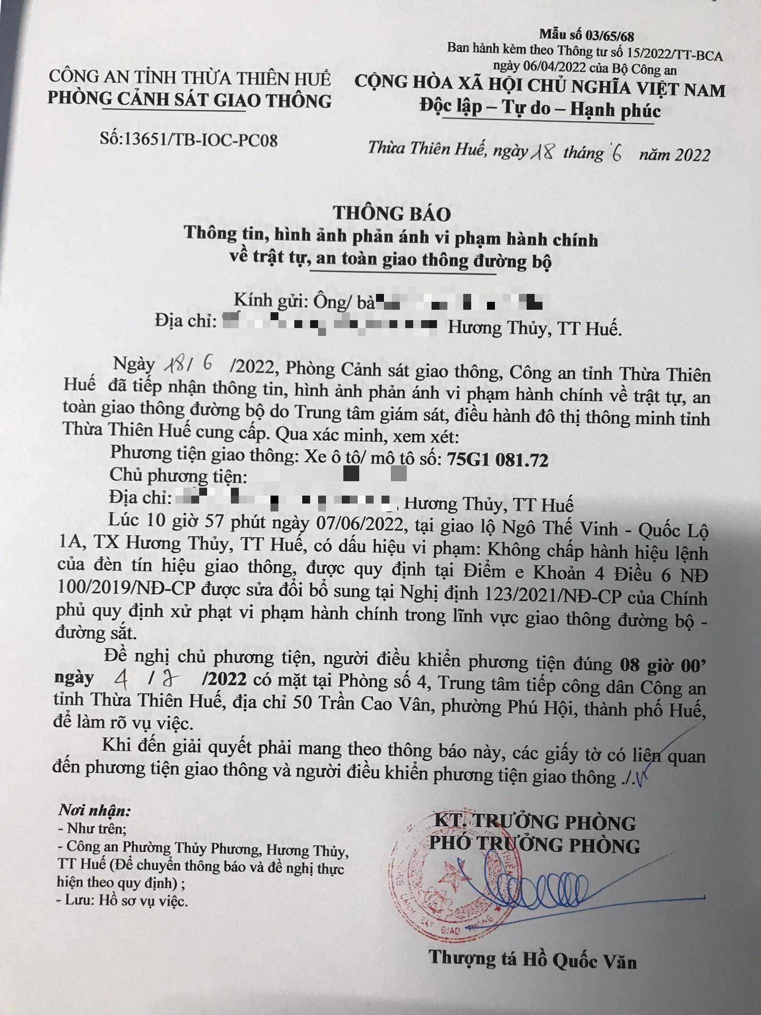 Phòng Cảnh sát giao thông đã gửi thông báo, yêu cầu chủ phương tiện đến làm việc vào ngày 04/7/2022. Tuy nhiên, hiện chủ phương tiện vẫn chưa trình diện tại cơ quan. Phòng Cảnh sát giao thông sẽ tiếp tục thông báo Công an địa phương nơi chủ phương tiện thường trú; đồng thời, thông báo các tổ tuần tra kiểm soát trên địa bàn, trong quá trình làm nhiệm vụ nếu phát hiện sẽ tiến hành dừng xe để xử lý.
