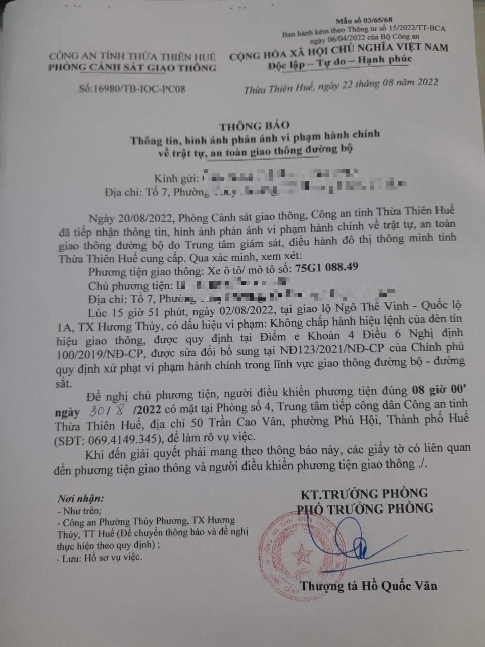 Vào lúc 15 giờ 51 phút, ngày 02/08/2022 Xe máy mang biển kiểm soát 75G108849 Không chấp hành hiệu lệnh của đèn tín hiệu giao thông tại địa điểm Ngô Thế Vinh - QL1A.
