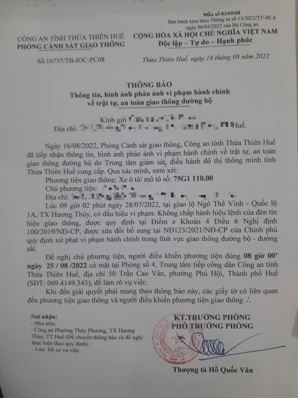 Vào lúc 09 giờ 02 phút ngày 28/07/2022, mô tô mang biển kiểm soát 75G111000 không chấp hành hiệu lệnh của đèn tín hiệu giao thông tại giao lộ Quốc Lộ 1A - Ngô Thế Vinh.