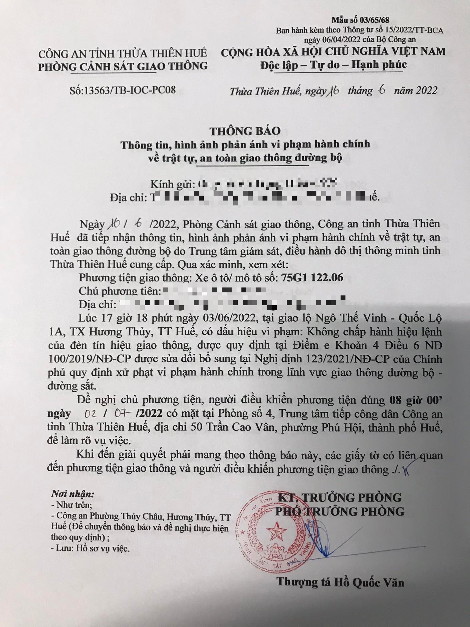 Vào lúc 17 giờ 18 phút ngày 03/06/2022, mô tô mang biển kiểm soát 75G112206 không chấp hành hiệu lệnh của đèn tín hiệu giao thông tại giao lộ Quốc Lộ 1A - Ngô Thế Vinh.