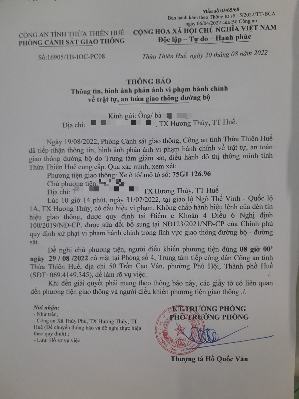 Vào lúc 10 giờ 14 phút, ngày 31/07/2022 Xe máy mang biển kiểm soát 75G112696 Không chấp hành hiệu lệnh của đèn tín hiệu giao thông tại địa điểm Ngô Thế Vinh - QL1A