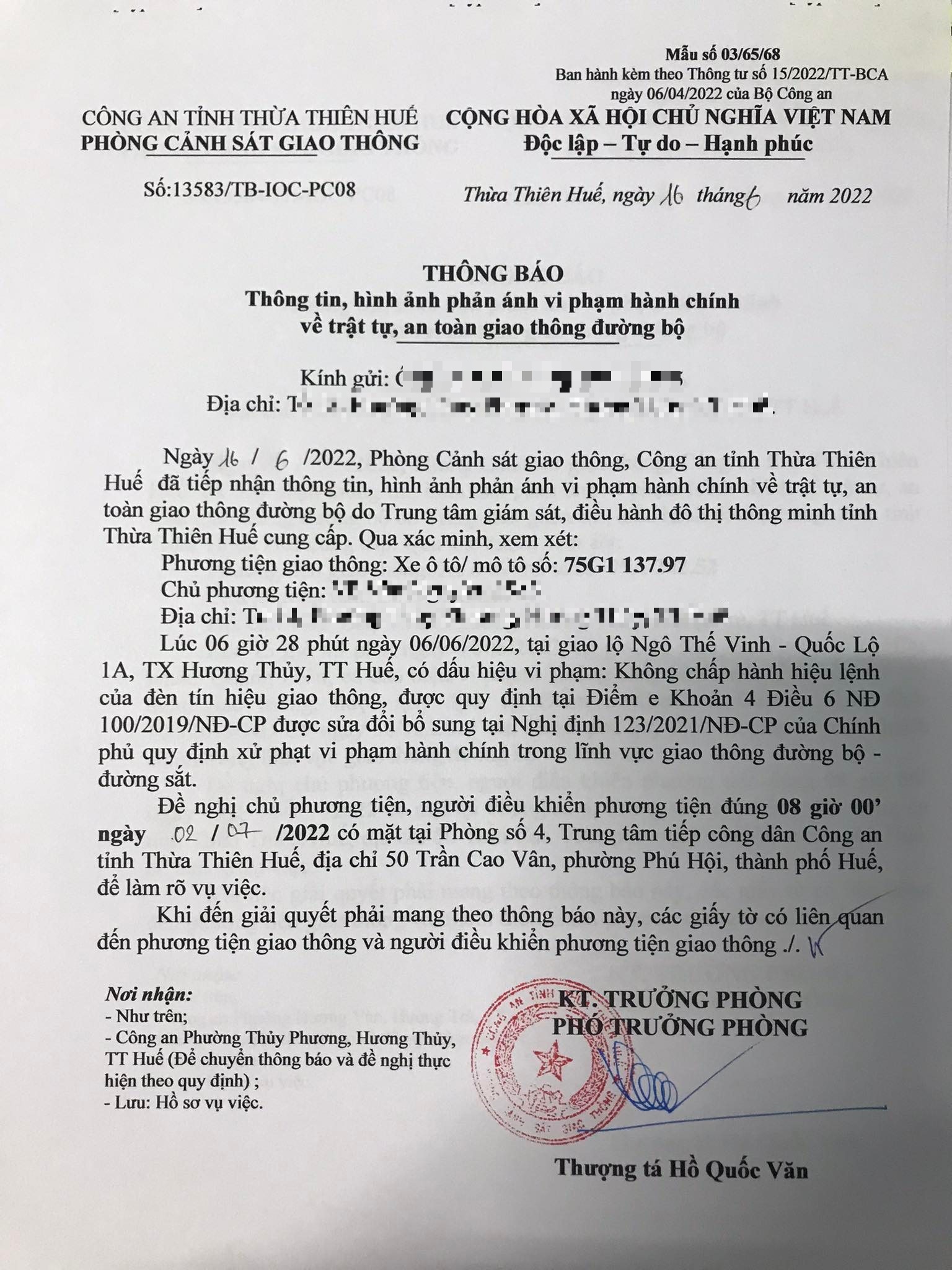 Vào lúc 06 giờ 28 phút ngày 06/06/2022, mô tô mang biển kiểm soát 75G113797 không chấp hành hiệu lệnh của đèn tín hiệu giao thông tại giao lộ Quốc Lộ 1A - Ngô Thế Vinh.