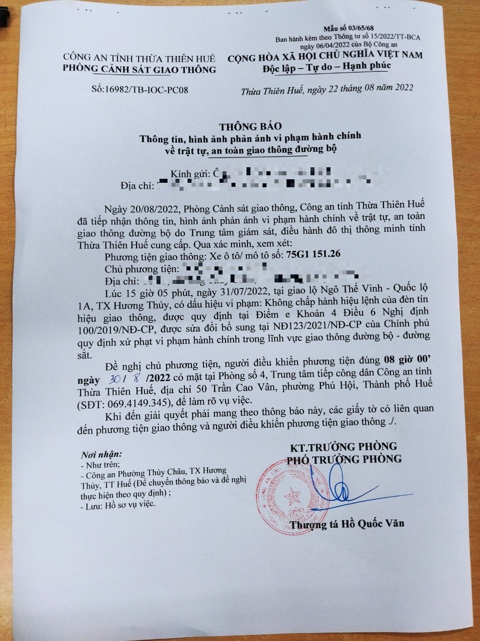 Vào lúc 15 giờ 05 phút, ngày 31/07/2022 Xe máy mang biển kiểm soát 75G115126 Không chấp hành hiệu lệnh của đèn tín hiệu giao thông tại địa điểm Ngô Thế Vinh - QL1A