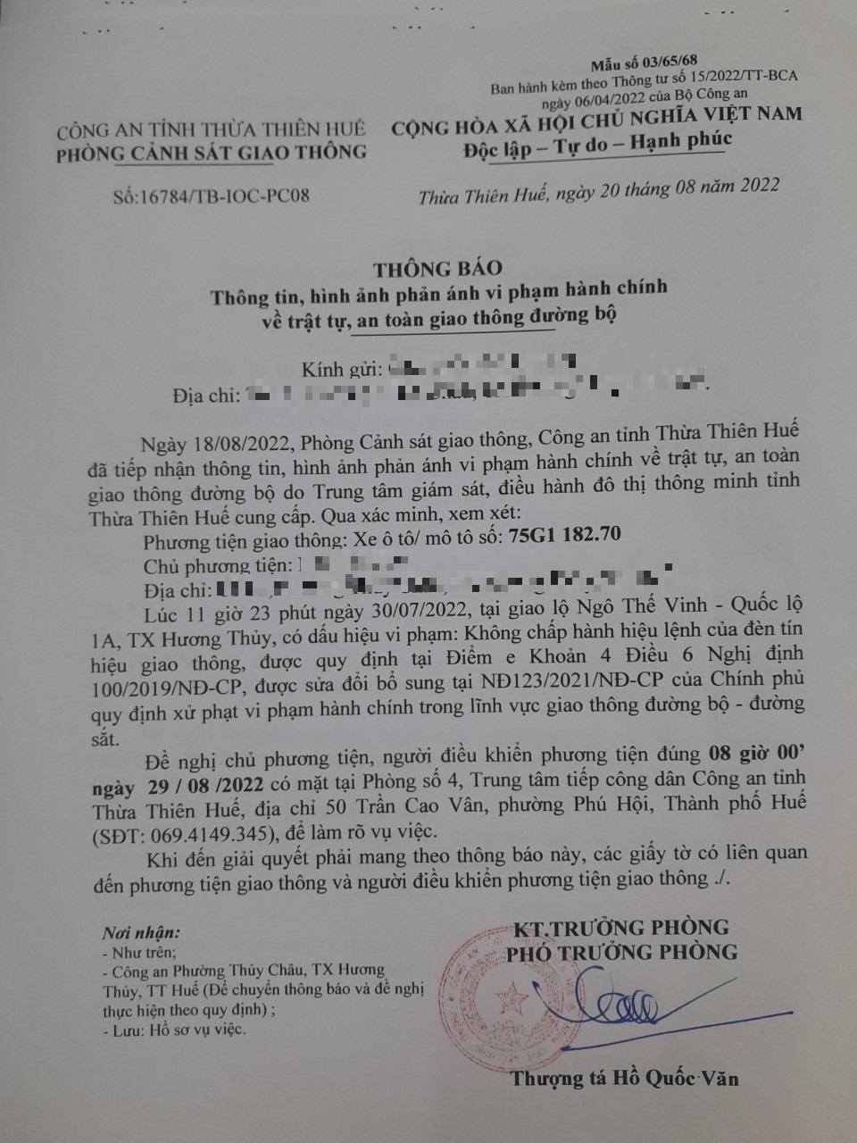 Vào lúc 11 giờ 23 phút ngày 30/07/2022, mô tô mang biển kiểm soát 75G118270 không chấp hành hiệu lệnh của đèn tín hiệu giao thông tại giao lộ Quốc Lộ 1A - Ngô Thế Vinh.