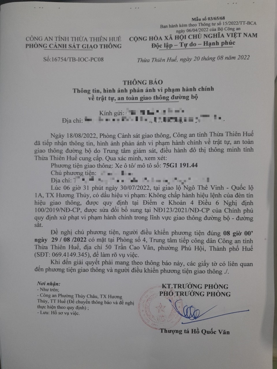 Vào lúc 06 giờ 31 phút ngày 30/07/2022, mô tô mang biển kiểm soát 75G119144 không chấp hành hiệu lệnh của đèn tín hiệu giao thông tại giao lộ Quốc Lộ 1A - Ngô Thế Vinh.