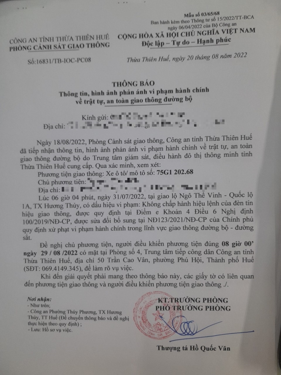 Vào lúc 06 giờ 04 phút, ngày 31/07/2022 Xe máy mang biển kiểm soát 75G120268 Không chấp hành hiệu lệnh của đèn tín hiệu giao thông tại địa điểm Ngô Thế Vinh - QL1A