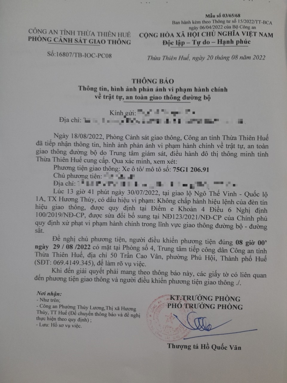 Vào lúc 13 giờ 41 phút ngày 30/07/2022, mô tô mang biển kiểm soát 75G120691 không chấp hành hiệu lệnh của đèn tín hiệu giao thông tại giao lộ Quốc Lộ 1A - Ngô Thế Vinh.