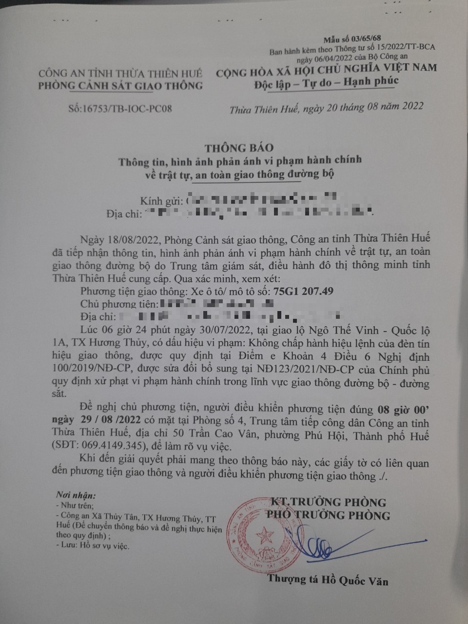 Vào lúc 06 giờ 24 phút ngày 30/07/2022, mô tô mang biển kiểm soát 75G120749 không chấp hành hiệu lệnh của đèn tín hiệu giao thông tại giao lộ Quốc Lộ 1A - Ngô Thế Vinh.