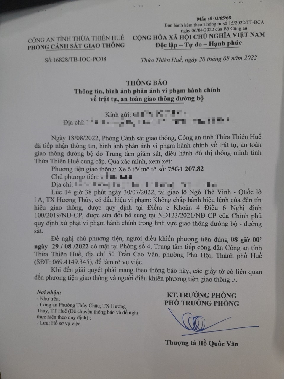 Vào lúc 14 giờ 38 phút ngày 30/07/2022, mô tô mang biển kiểm soát 75G120782 không chấp hành hiệu lệnh của đèn tín hiệu giao thông tại giao lộ Quốc Lộ 1A - Ngô Thế Vinh.