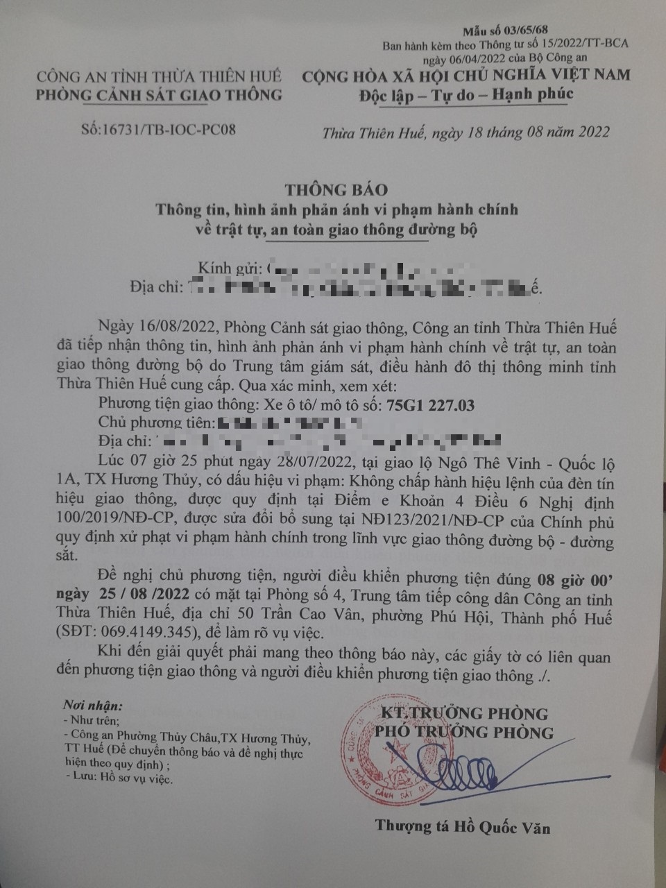 Vào lúc 07 giờ 25 phút ngày 28/07/2022, mô tô mang biển kiểm soát 75G122703 không chấp hành hiệu lệnh của đèn tín hiệu giao thông tại giao lộ Quốc Lộ 1A - Ngô Thế Vinh.
