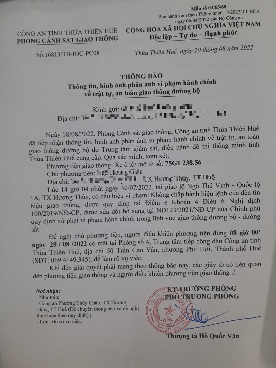 Vào lúc 14 giờ 04 phút ngày 30/07/2022, mô tô mang biển kiểm soát 75G123856 không chấp hành hiệu lệnh của đèn tín hiệu giao thông tại giao lộ Quốc Lộ 1A - Ngô Thế Vinh.