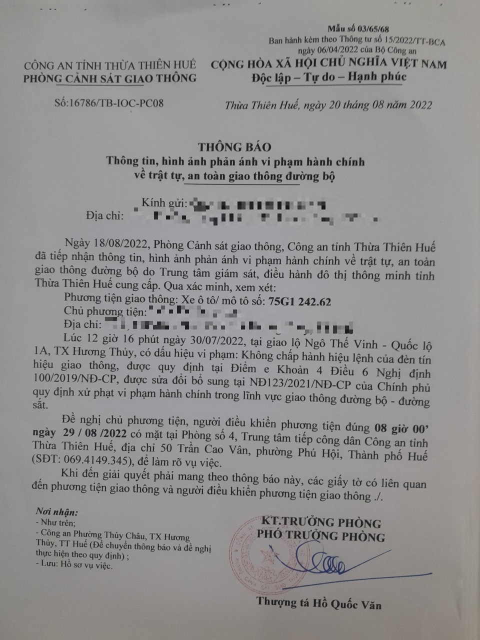 Vào lúc 12 giờ 16 phút ngày 30/07/2022, mô tô mang biển kiểm soát 75G124262 không chấp hành hiệu lệnh của đèn tín hiệu giao thông tại giao lộ Quốc Lộ 1A - Ngô Thế Vinh.