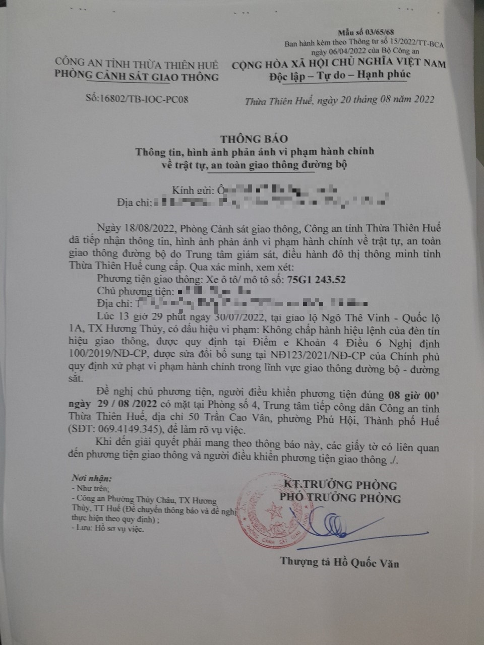 Vào lúc 13 giờ 29 phút ngày 30/07/2022, mô tô mang biển kiểm soát 75G124352 không chấp hành hiệu lệnh của đèn tín hiệu giao thông tại giao lộ Quốc Lộ 1A - Ngô Thế Vinh.