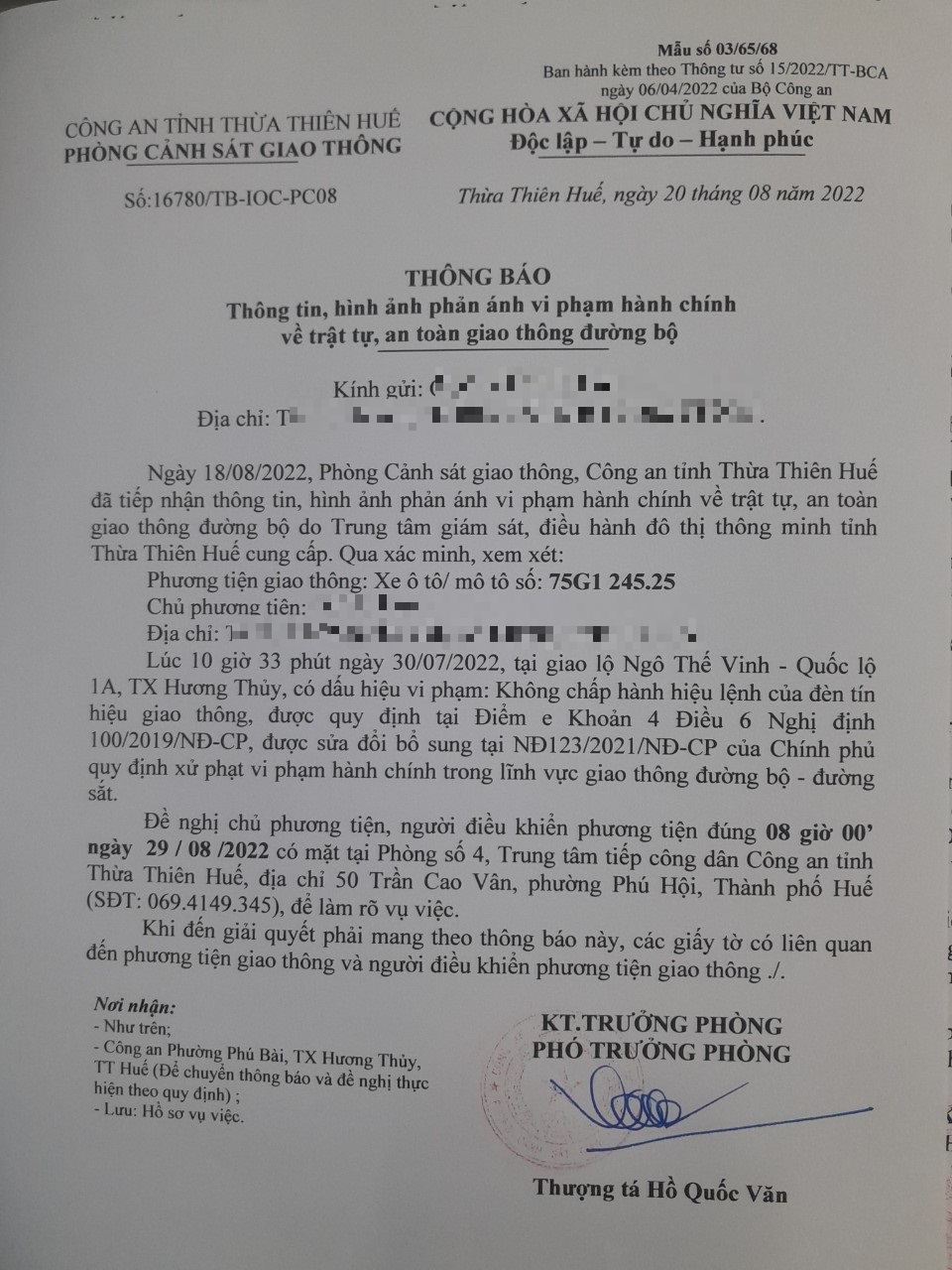 Vào lúc 10 giờ 33 phút ngày 30/07/2022, mô tô mang biển kiểm soát 75G124525 không chấp hành hiệu lệnh của đèn tín hiệu giao thông tại giao lộ Quốc Lộ 1A - Ngô Thế Vinh.