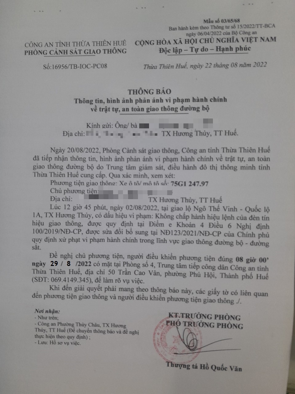 Vào lúc 12 giờ 45 phút, ngày 02/08/2022 Xe máy mang biển kiểm soát 75G124797 Không chấp hành hiệu lệnh của đèn tín hiệu giao thông tại địa điểm Ngô Thế Vinh - QL1A.