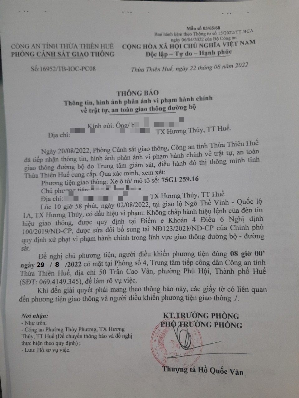 Vào lúc 10 giờ 58 phút, ngày 02/08/2022 Xe máy mang biển kiểm soát 75G125916 Không chấp hành hiệu lệnh của đèn tín hiệu giao thông tại địa điểm Ngô Thế Vinh - QL1A.