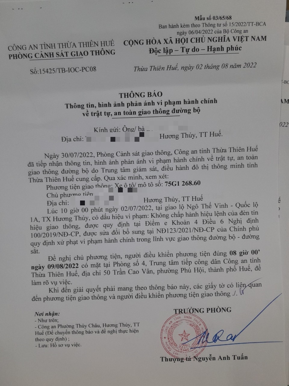 Vào lúc 10 giờ 00 phút ngày 02/07/2022, mô tô mang biển kiểm soát 75G126860 không chấp hành hiệu lệnh của đèn tín hiệu giao thông tại giao lộ Quốc Lộ 1A - Ngô Thế Vinh.