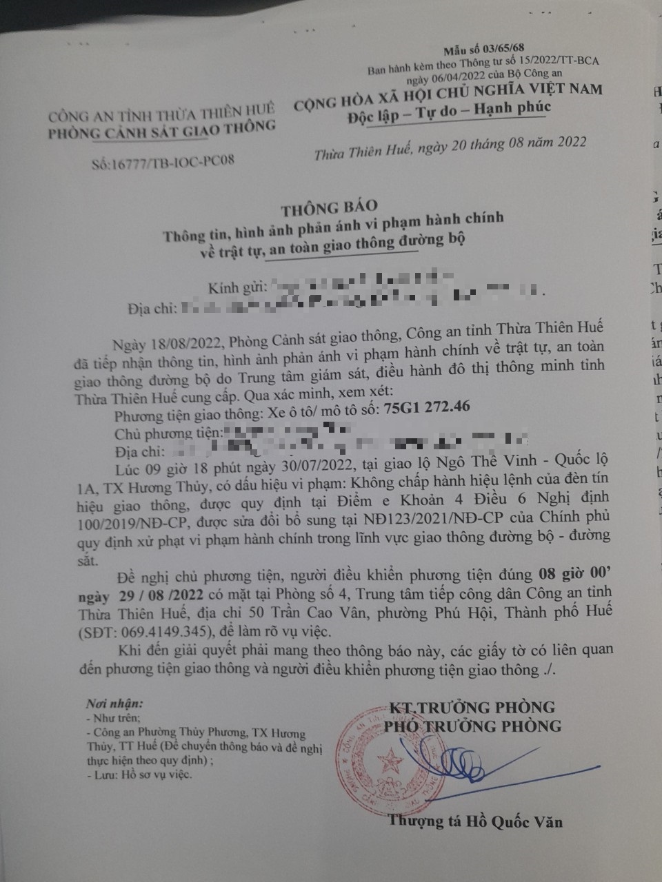 Vào lúc 09 giờ 18 phút ngày 30/07/2022, mô tô mang biển kiểm soát 75G127246 không chấp hành hiệu lệnh của đèn tín hiệu giao thông tại giao lộ Quốc Lộ 1A - Ngô Thế Vinh.