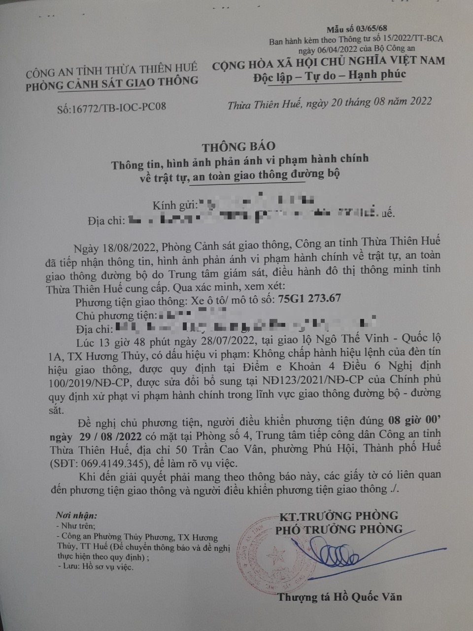 Vào lúc 13 giờ 48 phút ngày 28/07/2022, mô tô mang biển kiểm soát 75G127367 không chấp hành hiệu lệnh của đèn tín hiệu giao thông tại giao lộ Quốc Lộ 1A - Ngô Thế Vinh.