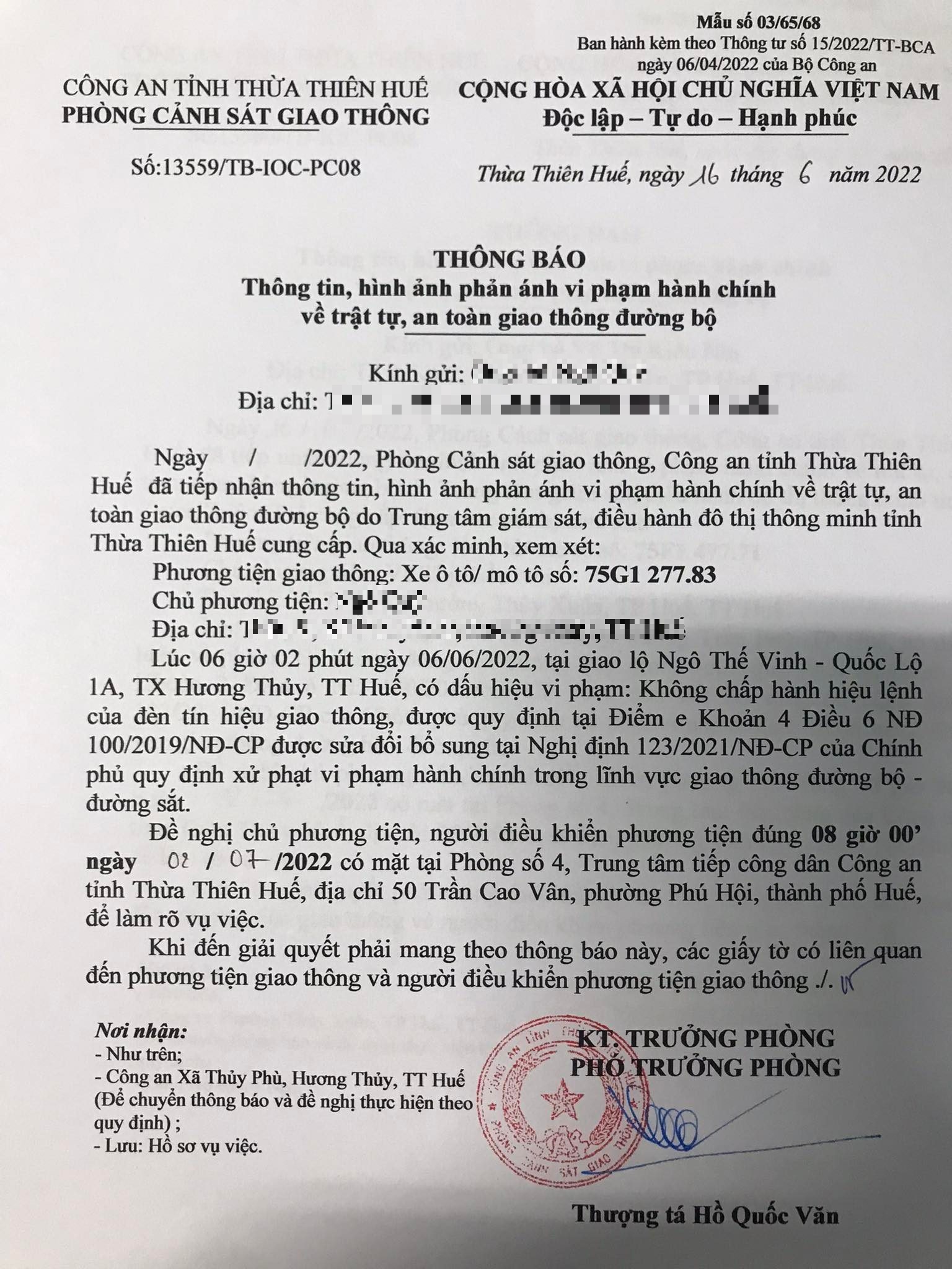 Vào lúc 06 giờ 02 phút ngày 06/06/2022, mô tô mang biển kiểm soát 75G127783 không chấp hành hiệu lệnh của đèn tín hiệu giao thông tại giao lộ Quốc Lộ 1A - Ngô Thế Vinh.