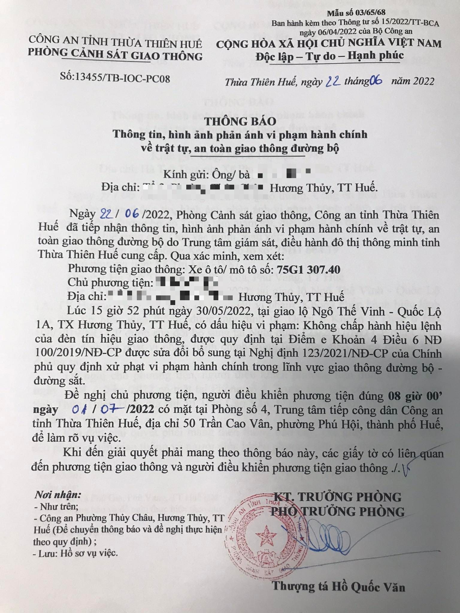 Phòng Cảnh sát giao thông đã gửi thông báo, yêu cầu chủ phương tiện đến làm việc vào ngày 01/7/2022. Tuy nhiên, hiện chủ phương tiện vẫn chưa trình diện tại cơ quan.Phòng Cảnh sát giao thông sẽ tiếp tục thông báo Công an địa phương nơi chủ phương tiện thường trú; đồng thời, thông báo các tổ tuần tra kiểm soát trên địa bàn, trong quá trình làm nhiệm vụ nếu phát hiện sẽ tiến hành dừng xe để xử lý.