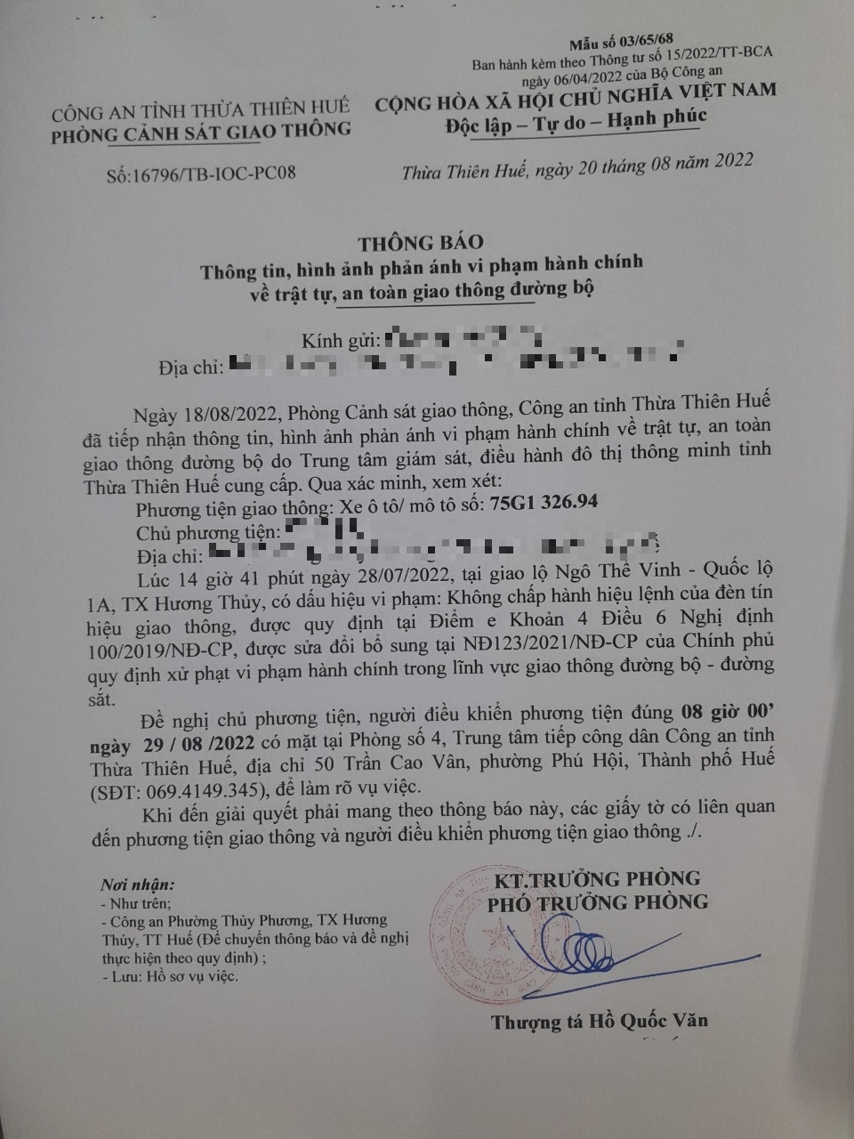 Vào lúc 14 giờ 41 phút ngày 28/07/2022, mô tô mang biển kiểm soát 75G132694 không chấp hành hiệu lệnh của đèn tín hiệu giao thông tại giao lộ Quốc Lộ 1A - Ngô Thế Vinh.