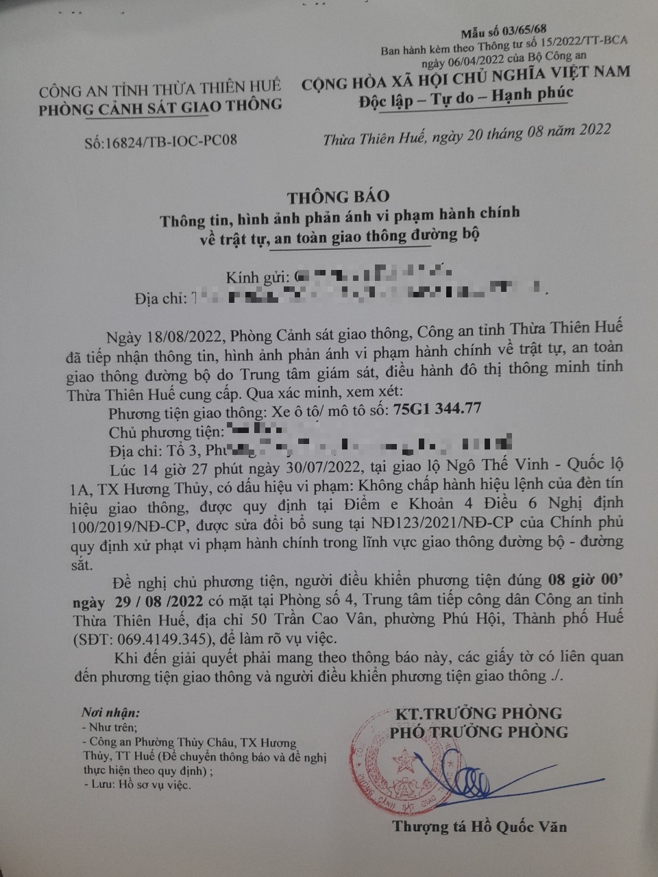Vào lúc 14 giờ 27 phút ngày 30/07/2022, mô tô mang biển kiểm soát 75G134477 không chấp hành hiệu lệnh của đèn tín hiệu giao thông tại giao lộ Quốc Lộ 1A - Ngô Thế Vinh.