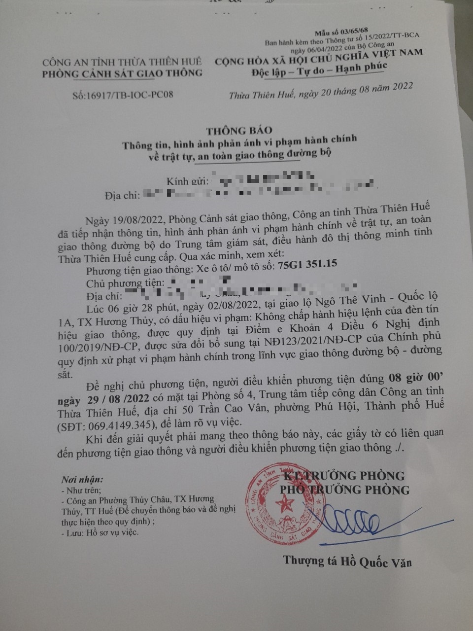 Vào lúc 13 giờ 20 phút ngày 30/07/2022, mô tô mang biển kiểm soát 75G135115 không chấp hành hiệu lệnh của đèn tín hiệu giao thông tại giao lộ Quốc Lộ 1A - Ngô Thế Vinh.