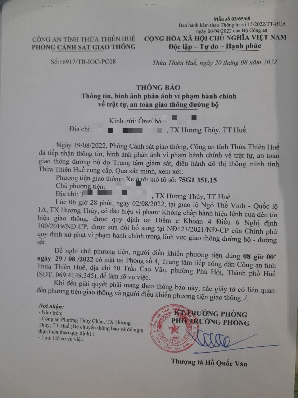 Vào lúc 06 giờ 28 phút, ngày 02/08/2022 Xe máy mang biển kiểm soát 75G135115 Không chấp hành hiệu lệnh của đèn tín hiệu giao thông tại địa điểm Ngô Thế Vinh - QL1A.