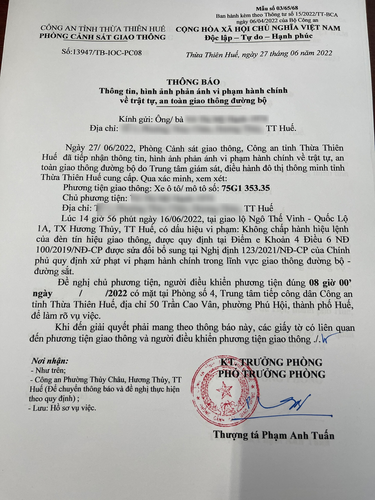 Phòng Cảnh sát giao thông xác định lỗi vi phạm của người điều khiển phương tiện: Không chấp hành hiệu lệnh đèn tín hiệu giao thông, quy định tại điểm e, khoản 4, điều 6 Nghị định 100/2019/NĐ-CP được sử đổi, bổ sung tại NĐ 123/2021/NĐ-CP.