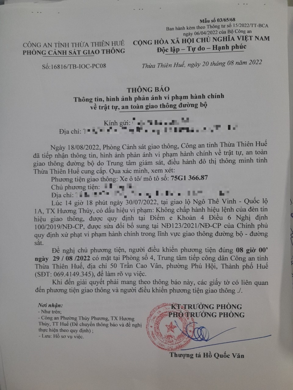 Vào lúc 14 giờ 18 phút ngày 30/07/2022, mô tô mang biển kiểm soát 75G136687 không chấp hành hiệu lệnh của đèn tín hiệu giao thông tại giao lộ Quốc Lộ 1A - Ngô Thế Vinh.