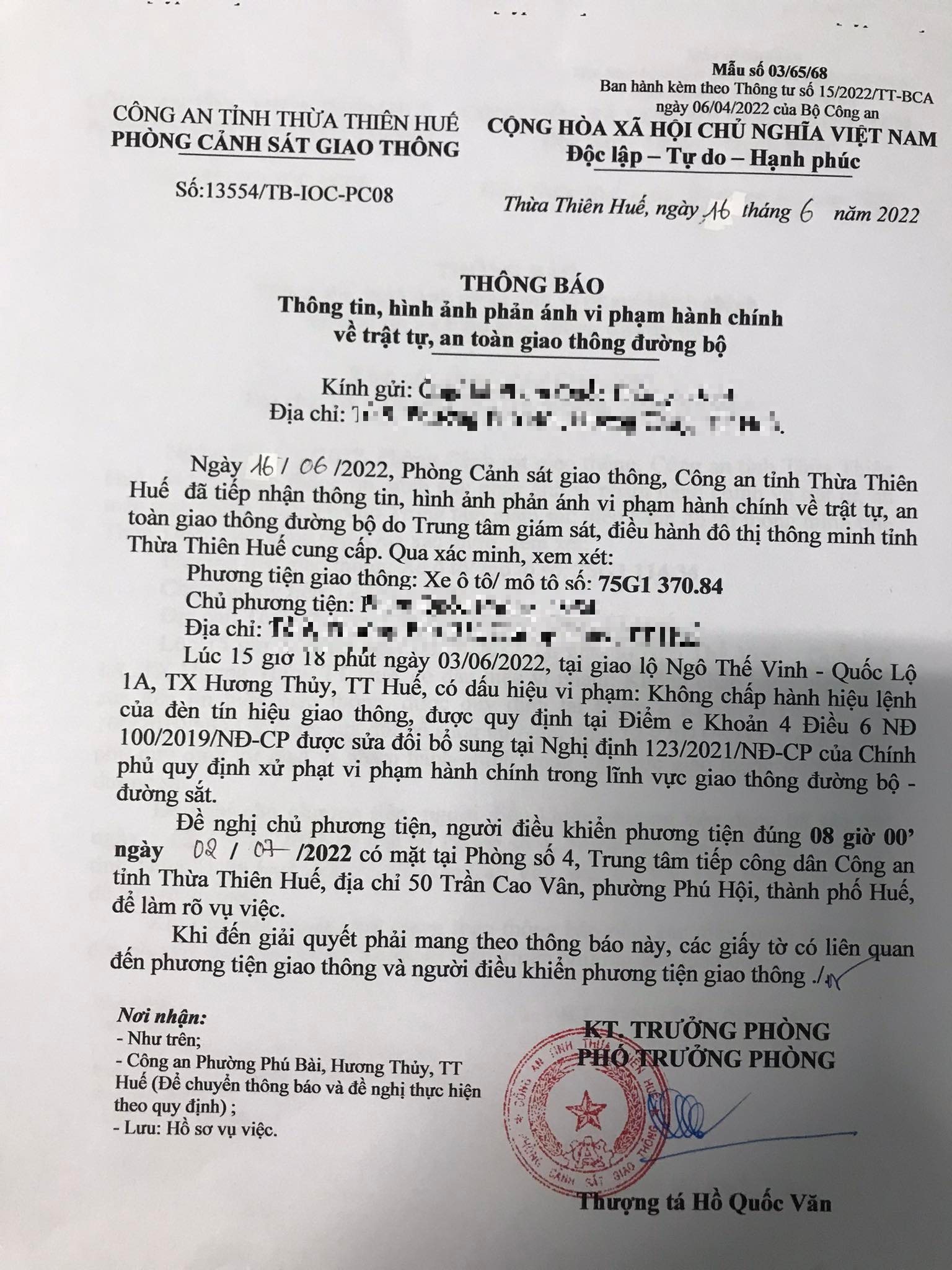 Vào lúc 15 giờ 18 phút ngày 03/06/2022, mô tô mang biển kiểm soát 75G137084 không chấp hành hiệu lệnh của đèn tín hiệu giao thông tại giao lộ Quốc Lộ 1A - Ngô Thế Vinh.