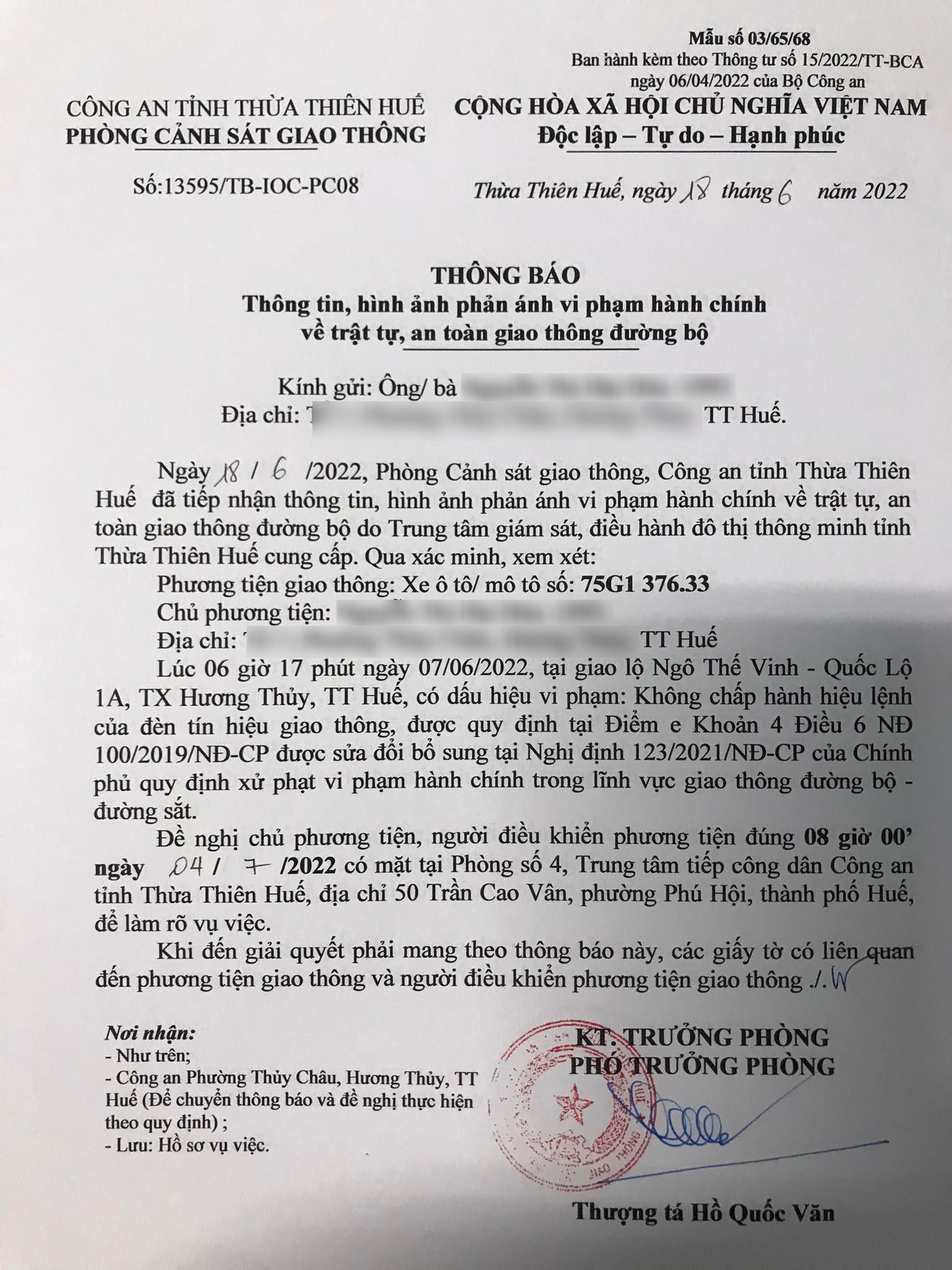 Phòng Cảnh sát giao thông xác định lỗi vi phạm của người điều khiển phương tiện 75G137633 như sau: Không chấp hành hiệu lệnh của đèn tín hiệu giao thông, quy định tại điểm e khoản 4 điều 6 Nghị định 100/2019/NĐ-CP được sửa đổi, bổ sung tại Nghị định 123/NĐ-CP ngày 28/12/2021.