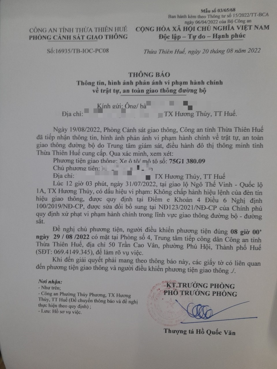 Vào lúc 12 giờ 03 phút, ngày 31/07/2022 Xe máy mang biển kiểm soát 75G138009 Không chấp hành hiệu lệnh của đèn tín hiệu giao thông tại địa điểm Ngô Thế Vinh - QL1A