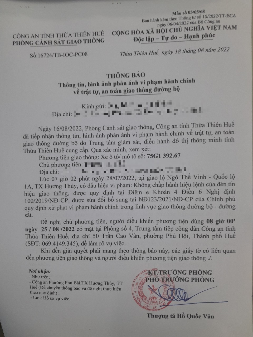 Vào lúc 07 giờ 02 phút ngày 28/07/2022, mô tô mang biển kiểm soát 75G139267 không chấp hành hiệu lệnh của đèn tín hiệu giao thông tại giao lộ Quốc Lộ 1A - Ngô Thế Vinh.