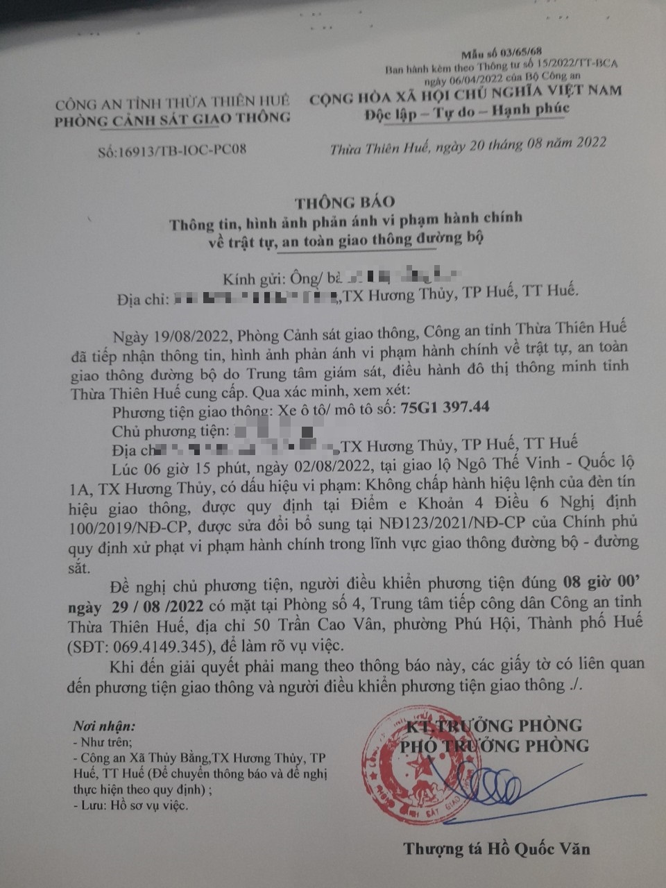 Vào lúc 06 giờ 15 phút, ngày 02/08/2022 Xe máy mang biển kiểm soát 75G139744 Không chấp hành hiệu lệnh của đèn tín hiệu giao thông tại địa điểm Ngô Thế Vinh - QL1A.