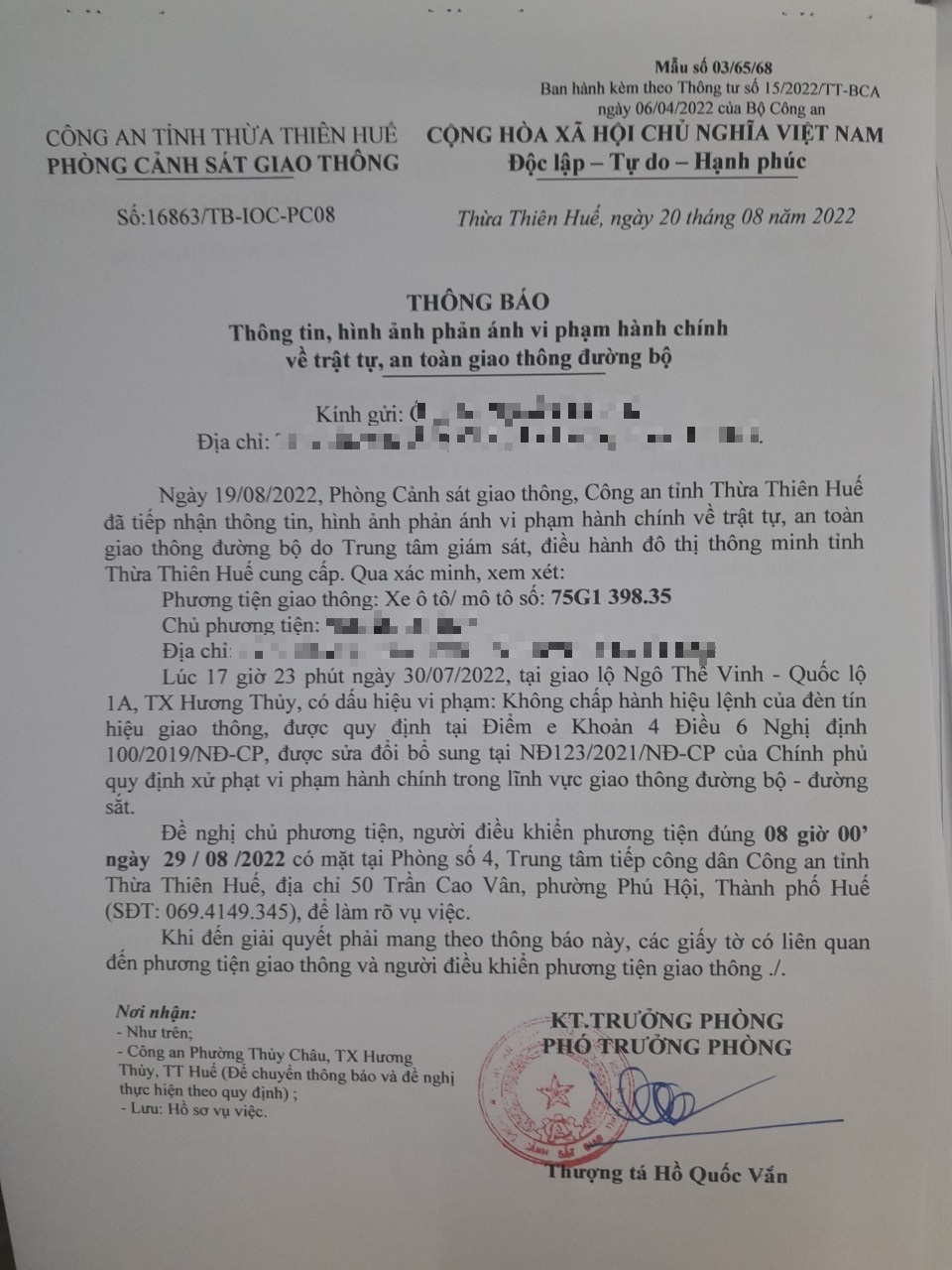Vào lúc 16 giờ 13 phút ngày 30/07/2022, mô tô mang biển kiểm soát 75G139835 không chấp hành hiệu lệnh của đèn tín hiệu giao thông tại giao lộ Quốc Lộ 1A - Ngô Thế Vinh.